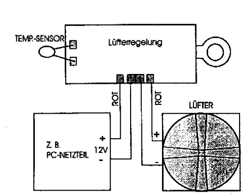 Die Schaltung ist denkbar einfach, die Steuerung wird also genau zwischen Spannungsquelle und Last (Lüfter) geschaltet.